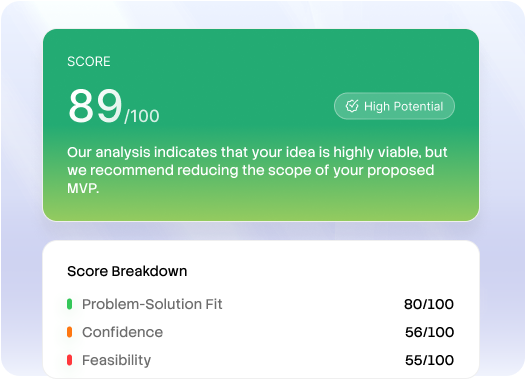 The score isn't arbitrary. Each dimension maps to a real build decision: a low Feasibility score means revisit the MVP scope; a low feasibility score signifies your MVP scope should be reconsidered; a low Confidence score suggests there's thin market data for your idea.